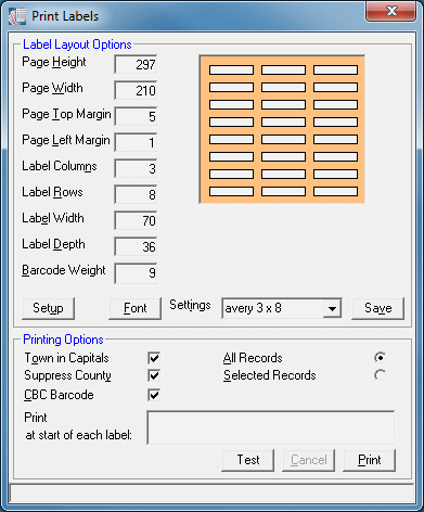 Setting up mailing labels therefore usually involves measuring the physical sheet of labels and entering these values into Postcode Plus, then using the Test button, and making minor adjustments to the settings on a trial-and-error basis until a satisfactory result is obtained.