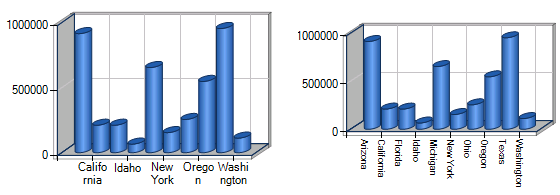 | Figure 10: The Column chart before setting the LabelAutoFit and LabelStyle Interval properties (shown left), and after setting those properties (shown right). |