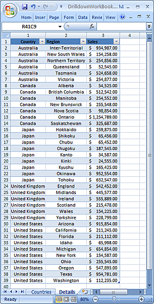 | Figure 2: Two Excel spreadsheets used as our example's datasource. One spreadsheet is called Countries (shown left), and the other is called Details (shown right). | |