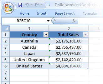 SELECT * FROM [Countries$]In the above statement, the name of the Excel spreadsheet is used in the square brackets, and followed immediately by the $ character. This statement will retrieve the data for the Pie chart. Retrieving the data for the Column chart will require a slightly more complex SQL statement like this:
