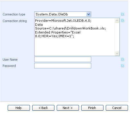 Source part of my connection string shows that my Excel file, called DrilldownWorkbook.xls, was saved in my shared folder of