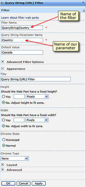 In this step we are going to add a Query String (URL) Filter web part and tell it to send its filtered results to the Column chart. Once added, this filter web part should be set up as shown in Figure 6 below. Give the filter a name, and tell it which parameter (the Country parameter) to use for the connection between it and the Column chart. You must also set a default value for this filter to use for when the Column chart is first rendered, we set Canada in Figure 6 below as the default country to display in this chart.