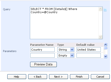 SELECT * FROM [Details$] WHERE Country=@CountryIn the above statement we use the Details spreadsheet, and we also define a parameter called Country that we will use to filter the data retrieved from that spreadsheet. By specifying the Country parameter, we can retrieve all of the data for any one country in our Details spreadsheet. Figure 4 shows how to set the Country parameter in step 3 of the wizard.