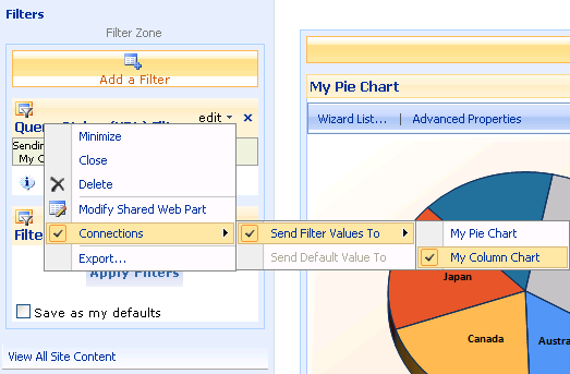 Figure 7: Connect both the Pie and Column chart to the Query String (URL) Filter. |