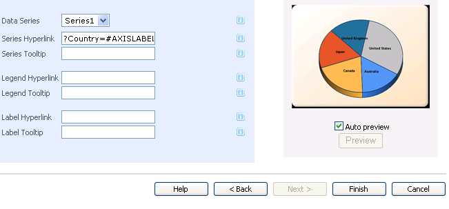 Since we are going to use the Pie chart as the dynamic component of our example, we must set up its clickable area to make it set the value of our Country parameter for our filter to use. Open the Chart Customization Wizard and proceed directly to the Interactive Features tab in the last step. Figure 9 below shows you how to set up the Series Hyperlink so that it will assign a value to our Country parameter, which will in turn be used by our filter to retrieve and filter its data, and then send that filtered data to the Column chart as required. This is the final step in linking all of the components together so that drilldown can be performed.