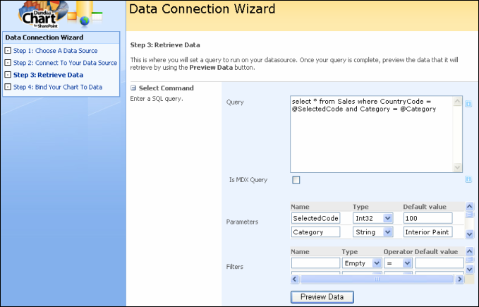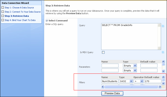 Once you reach Step 3 of the Data Connection Wizard, you will see a set of parameter controls for filtering the data from your data source. The parameter controls work somewhat differently depending on the type of data source.