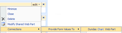 Once you have finished with the Data Connection Wizard, you can connect other web parts on your page to the Dundas web part to set the values of the parameters you have just added. These web parts include the Form Web Part, MOSS 2007 filter web parts, and custom web parts that implement the IWebPartField interface.