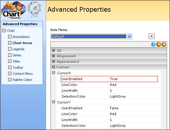 - Set the UserEnabled property of either cursor (or both cursors) to true as shown in Figure 1 below. This property enables interactive scrolling and zooming on the corresponding axis.