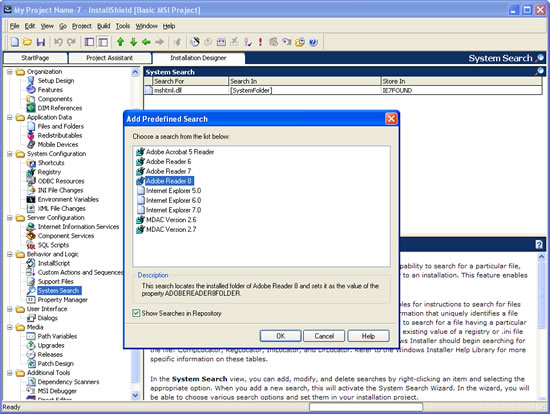 InstallShield has new predefined system searches: o Adobe Reader 10 o Internet Explorer 9 o Microsoft Office 2010 o Microsoft Office 2007 o Microsoft Office 2003 |