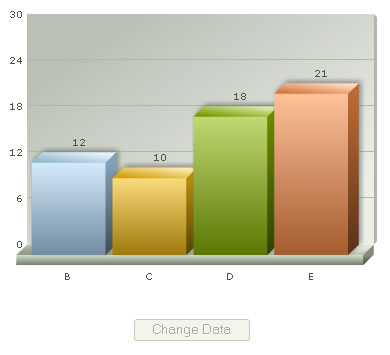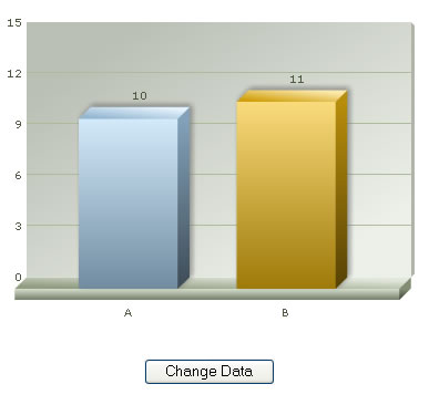 In the above code, we're first creating a Column 3D chart with DOM Id as chart1Id. We also register it with JavaScript. We initially provide the following data to the chart and ask it to render: <chart><set label='A' value='10' /><set label='B' value='11' /></chart> Thereafter, we're creating a button, which when clicked would update the chart with new XML data. The button calls the updateChart() JavaScript function when clicked. The updateChart() JavaScript function has the following code to update the chart: |