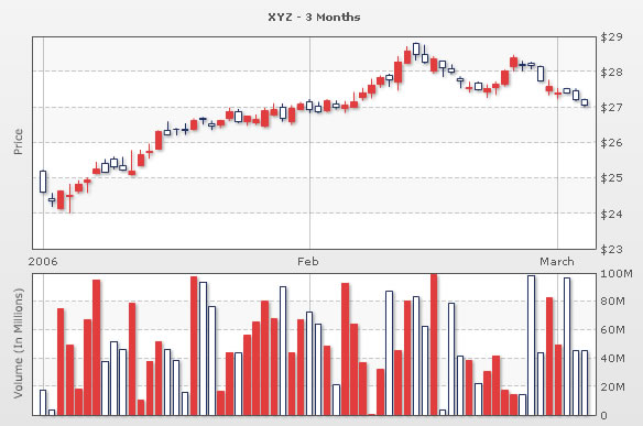 <chart palette='1' numPDivLines='5' caption='XYZ - 3 Months' numberPrefix='$' bearBorderColor='E33C3C' bearFillColor='E33C3C' bullBorderColor='1F3165' PYAxisName='Price' VYAxisName='Volume (In Millions)'> <dataset> </dataset> |
