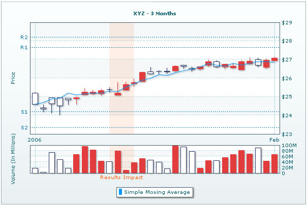 The <chart> element is the root element of the candlestick chart, like any other chart in FusionCharts v3 framework. It has a lot of properties that set the functional and cosmetic behavior of the chart. You can find the complete list of properties in Chart XML Sheet section. Next, you've the <categories> and <category> element which define the x-axis labels for the chart. Each label needs to have a x position value and label. You can also opt to show a vertical line for each category label. FusionCharts Candlestick chart has both x-axis and y-axis as numeric. This chart doesn't directly accept dates for the data and category labels. Instead, it accepts a x-value for each data. This allows for greater flexibility as you can plot days, hours, weeks, months, years etc. using this chart. Converting your dates into x-values is very simple. Using your server side script, select the first date in your chart as base date. Now, use date difference function (w.r.t to this base date) to get the x-values for each date. So, if you want to show daily quotes on the chart, you can use "day" as the date difference parameter. Similarly, if you want to show weekly quote, you can use weeks as the date difference parameter and so on. Now, for each data, you need to provide the x-value, opening price, closing price, high and low price for the given time frame. If you're plotting a line chart for the price, you can choose which price to plot - opening or closing. Also, high and low prices are not required in case of line plot. You can additionally provide the volume figure if you also want a volume chart to be plotted. Advanced features in this chart include plotting of trend lines, trend sets (indicators) etc. as shown below: |